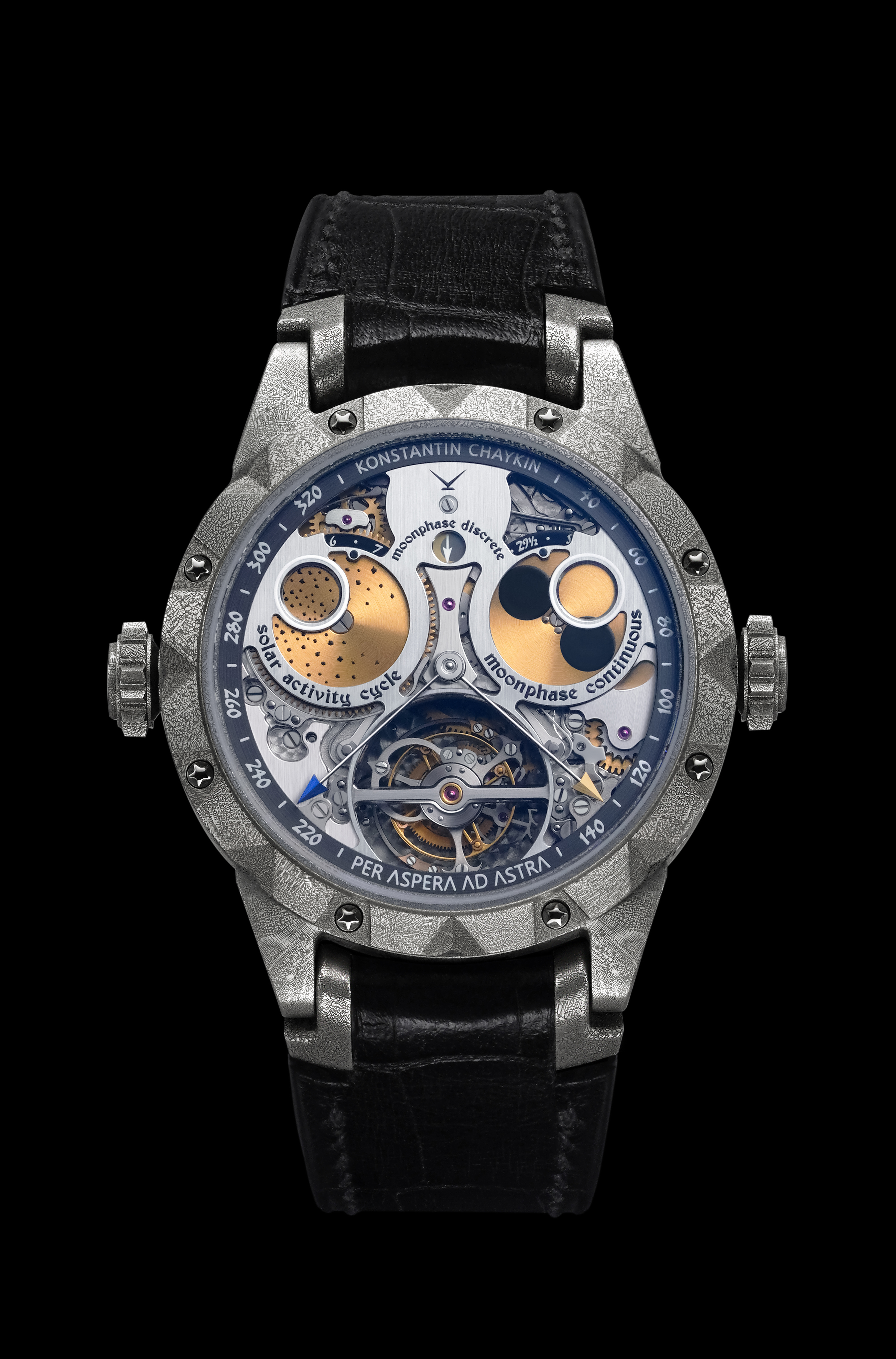 Konstantin Chaykin has invented a new type of moonphase of the discrete type. It shows four traditional moon phases – new moon, waxing moon, full moon and waning moon - and has a jumping action. The phases are marked with icons, making it easy and convenient to read it.