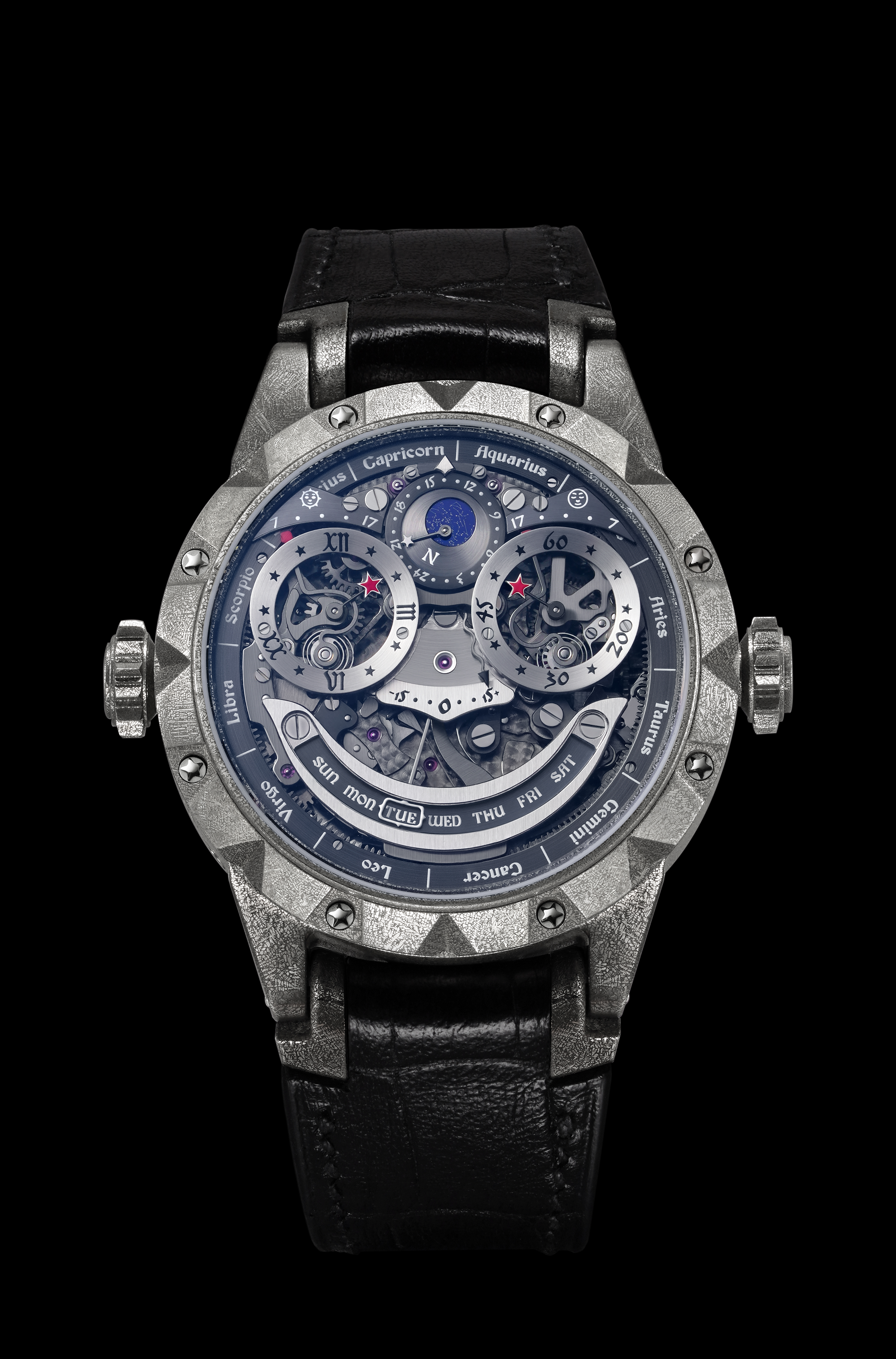 On the dark side, with the signature joker-indication module, the eyebrows indicate the length of the day and night, the nose is the equation of time indicator, and the third eye serves as a miniature but technically detailed planisphere – a star map. It is probably the smallest star chart in the history of watchmaking. This dial also features a 24-hour display of mean solar and sidereal time. The smile of the watch acts as a retrograde indicator of the day of the week, and there is a zodiac ring along the edge of the dial.