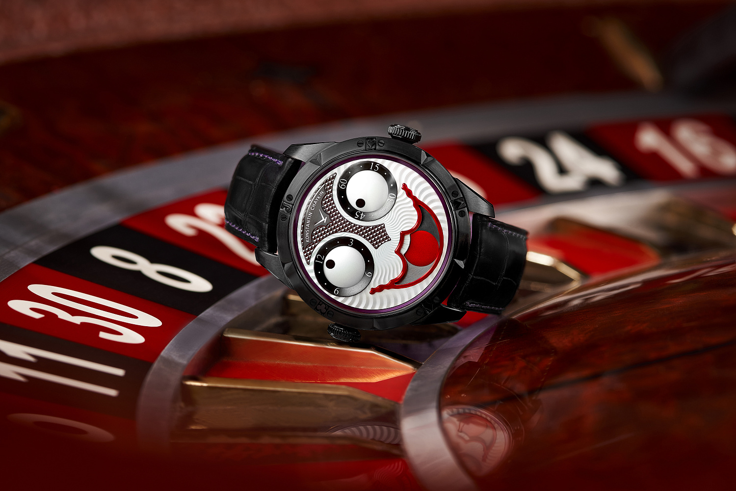 Konstantin Chaykin suggests playing roulette with fate. Russian roulette? Of course, not – we feel that is a theme exploited far too often. So, what will it be? The Master of Jokers, acting in a way only he knows, creates a fusion of essences and traditions. In the Joker Black Bet watch, he complements the adventurous character of his Joker, a lucky symbol in card games, with the gambling spirit of roulette. And that is why this new Joker has a spark in his eyes!