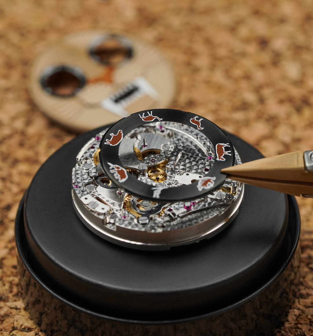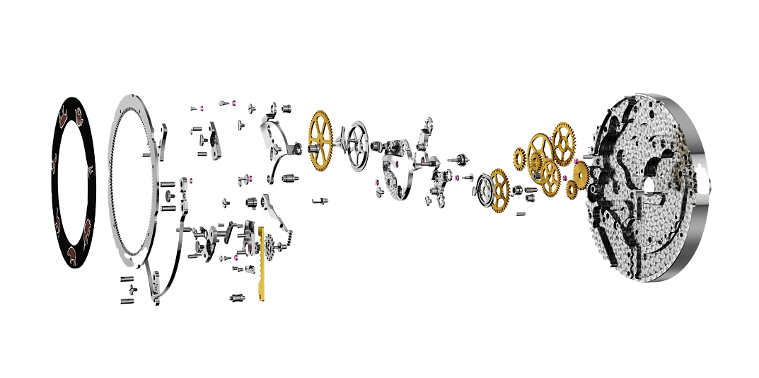 The Smilodon watch is equipped with an automatic К.08-2 caliber. The in-house indication module was designed by Konstantin Chaykin and assembled of 142 parts.