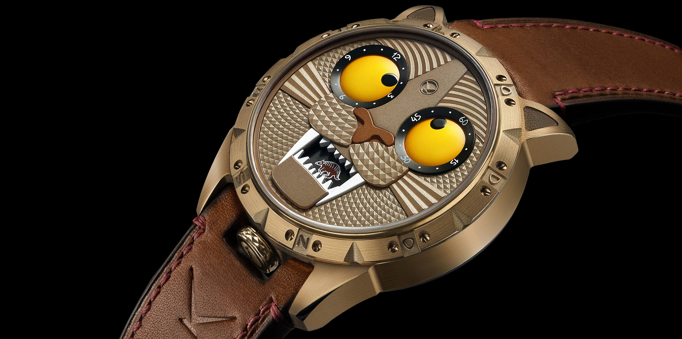 The case with a diameter of 42 mm and a thickness of 13 mm is made of ferrous bronze. The upper lugs are shaped like the ears of a Smilodon, and the lower lugs retain the beveled shape that is classic for the Wristmons collection.